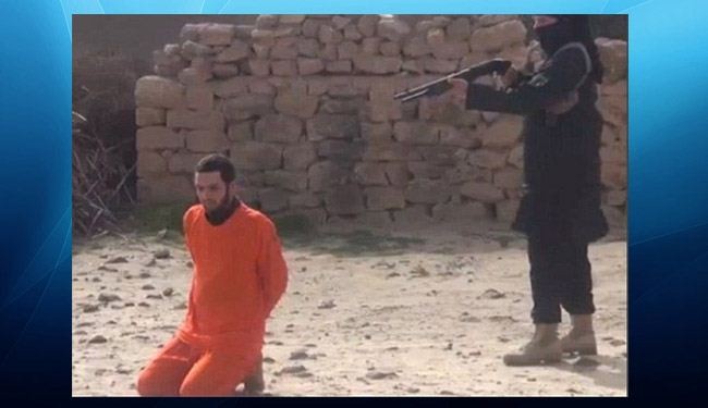 بث تنظيم "داعش" الارهابي شريط فيديو لأحد عناصر التنظيم يقتل شخصاً يرتدي اللباس البرتقالي بسلاح "البومب اكشن".